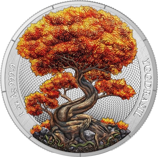 • Yggdrasil in prächtigen Herbstfarben – kunstvolle Metallic-Colorierung auf 1 Unze Reinsilber