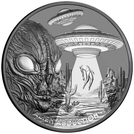 Das atemberaubende Design zeigt eine detailreich gestaltete Alien-Figur mit großen, ausdrucksstarken Augen, die den Betrachter förmlich in ihren Bann zieht. Im Hintergrund schweben klassische UFOs über einer mysteriösen Wüstenlandschaft mit Kakteen. Die Szene wird durch einen dramatischen Lichtstrahl vervollständigt, der eine menschliche Silhouette in das Raumschiff zu ziehen scheint. Diese meisterhafte Komposition macht die Münze zu einem wahren Kunstwerk.