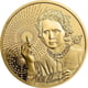 Die Vorderseite dieser Goldmünze zeigt Marie Curie. Sie hält ein kleines Fläschchen in der Hand und ist offensichtlich gerade am Experimentieren. Sie trägt ein lockeres Kleid. Ihre Haare sind kurz und gelockt. Sie ist bekannt dafür, dass sie gemeinsam mit ihrem Ehemann Pierre Currie die chemischen Elemente Polonium und Radium entdeckt hat. Aus diesem Grund ist im Hintergrund des Motivs auch die chemische Abkürzung Ra zu sehen. Radium ist ein Element, das von Natur aus radioaktiv ist. Für ihre Errungenschaften wurde sie belohnt und mit einem Nobelpreis in Physik und einem in Chemie ausgezeichnet. Im Ersten Weltkrieg hat es sich Marie Curie zur Aufgabe gemacht, verletzten Soldaten zu helfen. Sie hat dafür einen Röntgenwagen erfunden. Ihre Arbeit mit radioaktiven Strahlungen hatte allerdings tödliche Folgen für die hochintelligente Wissenschaftlerin. Sie starb am 4. Juli. 1934 im Alter von 66 Jahren an Leukämie.