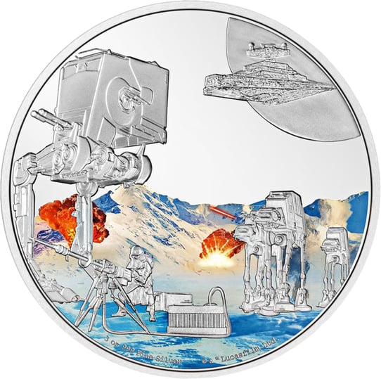 Geprägt von der New Zealand Mint, bildet die  limitierte 3 Unze Star Wars Münze in Silber die wohl bekannteste Schlacht der Star Wars Reihe mit einem teilweise kolorierten Motiv ab. Nicht allein der 10 Dollar-Nennwert, sondern auch die stilvoll geriffelte Umrandung der Münze wirkt einzigartig auf alle Silber-Sammler. Auf der Motivseite ist  AT-AT Walker™, sowie AT-ST Walker™ im Kampf gegen die Rebellen zu sehen. Abgerundet wird alles am Boden durch den Versuch des Snowtroopers™ eine Rakete abzuschießen, während am Himmel der Sternenzerstörer™ des Imperiums die Schlacht von Hoth überwacht. Außerdem besticht die Rückseite mit dem Portrait von Queen Elizabeth ll. und den Schriftzügen “Elizabeth ll. Niue Ten Dollars” und dem Prägejahr 2022.