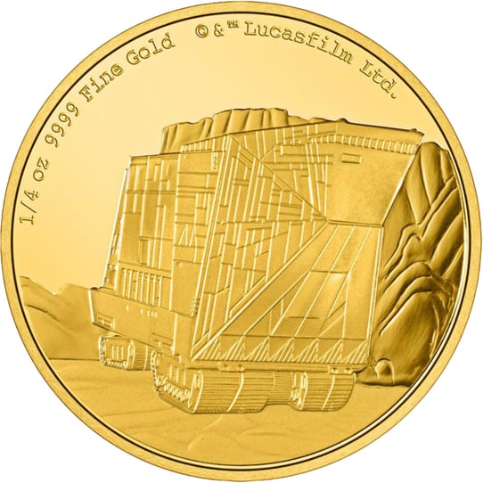 Die zweite Ausgabe der limitierten „Vehicles“ Serie ist dem Sandcrawler™ gewidmet. Die einzigartige STAR WARS™ Sandcrawler™ Münze wurde aus einer Viertel Unze Feingold in der höchsten Prägequalität, der Polierten Platte, geprägt. Das gepanzerte Fahrzeug rollt durch die Wüstenlandschaft von Tatooine™. Am oberen Rand befindet sich die Angabe von einer Unze 999,9er Feingold. Auch das offizielle Copyright von Lucasfilm Ltd.™ ist zu sehen.