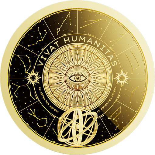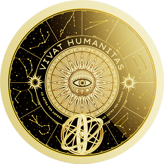 Das Prooflike-Finish der Münze verleiht ihr einen außergewöhnlichen Glanz, der die Details des Designs hervorhebt und sie zu einem wahren Blickfang macht. Die Vorderseite ziert die Inschrift „VIVAT HUMANITAS“, die das Motto der Serie trägt und die Errungenschaften der Menschheit würdigt. Zusätzlich sind auf der Vorderseite Angaben zum Gewicht und zur Reinheit des Edelmetalls zu finden, was die Qualität und Authentizität dieses Gold-Produkts bestätigt.