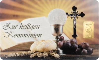 Der Goldbarren, zentral in einer Karte, die eine aufgeschlagene Bibel, einen Kelch mit Hostie, einen Laib Brot, Weintrauben und ein Kruzifix zeigt, ist nicht nur ein Geschenk zur Kommunion, sondern auch ein Ausdruck der Wertschätzung und des Glaubens an die Zukunft. Der Barren selbst ist von höchster Qualität, mit einem Feingehalt von 999/1.000, er ist LBMA-zertifiziert und trägt das Siegel „Made in Germany“, ein Zeichen für Präzision und Qualität.