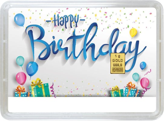 Bunt und fröhlich sowie mit einem kleinen Goldbarren als Highlight – das ist das Design dieses 1 g schweren Goldbarrens. Auf der Verpackung im Scheckkartenformat sind der Schriftzug „Happy Birthday“ sowie viele bunte Luftballons und Geschenkpakete zu sehen. Der kleine Goldbarren ist in die Karte integriert und mit dem Gewicht von 1 g, dem Feinheitsgrad von 999,9 und der Prägung „GOLD“ versehen. Dazu erhalten Sie ein Echtheitszertifikat.