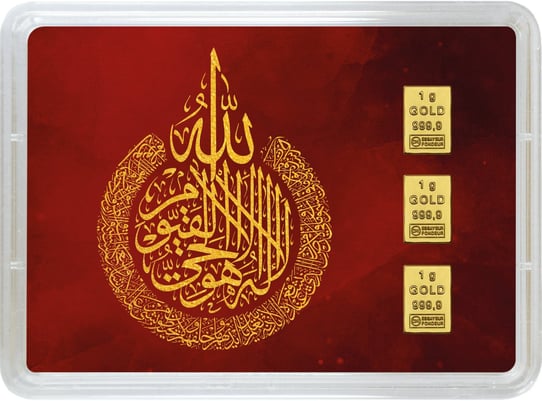 Wenn Sie nach einem Geschenk suchen, das nicht nur von zeitloser Schönheit, sondern auch von bleibendem Wert ist, dann ist ein Goldbarren zur Hochzeit eine exzellente Wahl. Dieser exquisite 3g Goldbarren "Zur Hochzeit" von Valcambi verkörpert die Stärke und Reinheit der Ehe und ist mit einem bedeutungsvollen Kippbild verziert, welches das Symbol der Eheschließung und einen Schutzvers zeigt. Der Ayet-el-Kürsi Vers ist dabei mehr als nur Dekoration; er ist ein traditioneller Segen für das Brautpaar und soll eine beschützende Wirkung für die gemeinsame Zukunft entfalten.