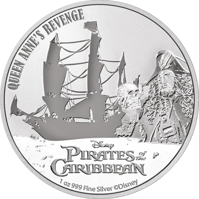 Die Münze beeindruckt mit ihrer hohen Qualität und ihrem detailreichen Design. Auf der Motivseite wird das Piratenschiff Queen Anne's Revenge in all seiner Pracht dargestellt, zusammen mit dem berüchtigten Piratenkapitän Edward Teach, der einen Totenkopf in seiner Hand hält. Der Name der Ausgabe "QUEEN ANNE'S REVENGE", die Inschrift "Disney PIRATES of the CARIBBEAN", das Feingewicht und die Feinheit "1 oz 999 Fine Silver" sind ebenfalls auf dieser Seite dargestellt.