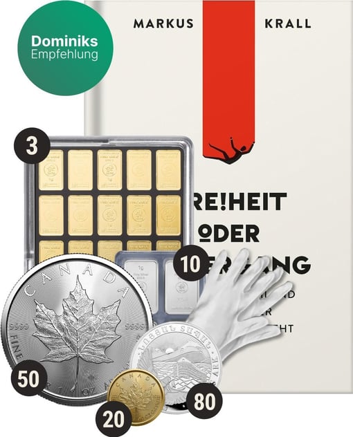 Zusätzlich zu diesen hochwertigen Edelmetallen erhalten Sie als Gratiszugabe ein Paar Baumwollhandschuhe, um Ihre Edelmetalle sicher handhaben zu können, sowie das Buch "Freiheit oder Untergang" von Markus Krall. Dieses Buch liefert wertvolle Einblicke in die Welt der Edelmetalle und deren Rolle in der Wirtschaft.