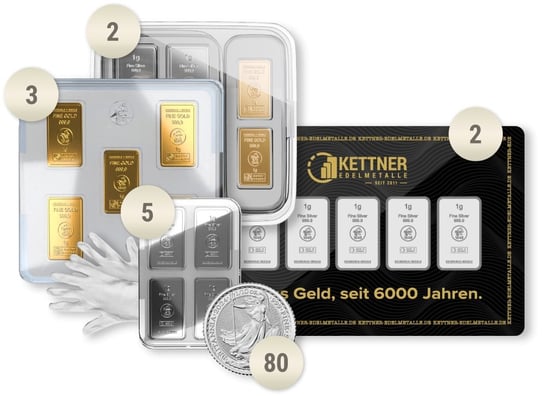 Die Einlagensicherung M ist ein exklusives Bündel, das aus verschiedenen hochwertigen Edelmetallen besteht. Diese Diversifikation ermöglicht es Ihnen, von den Vorzügen mehrerer Edelmetalle gleichzeitig zu profitieren. Das Paket umfasst: