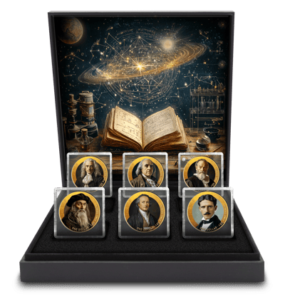 Jede der sechs Münzen dieses exklusiven Sets zeigt ein beeindruckendes Motiv eines der größten Denker der Menschheitsgeschichte: