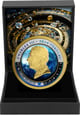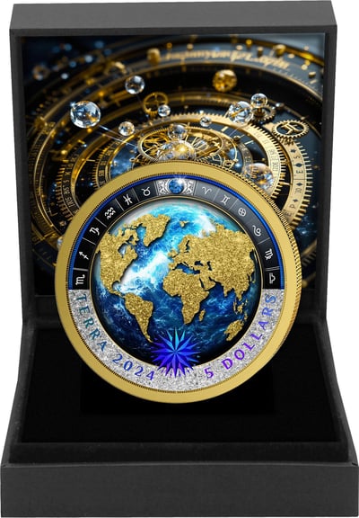 Das Motiv zeigt eine kunstvoll gestaltete Weltkarte mit vergoldeten Kontinenten vor einem tiefblauen Ozean-Hintergrund. Umrahmt wird das Motiv von einem Ring mit den zwölf Tierkreiszeichen und einer mit Diamantstaub veredelten Beschriftung. Die teilvergoldete Münze wird in einem hochwertigen Etui geliefert und ist damit perfekt vor äußeren Einflüssen geschützt.
