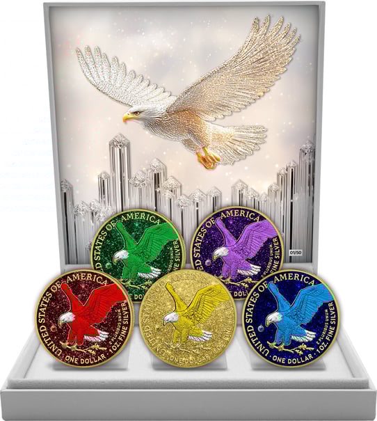 - Motiv: Ikonischer American Eagle in fünf spektakulären Farbvarianten mit Edelsteinbesatz