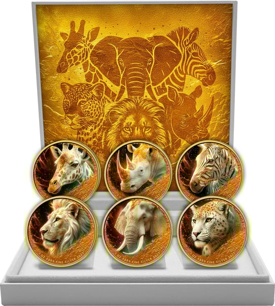 Meisterhafte Goldveredelung auf 999,9er Feinsilber: Sechs majestätische afrikanische Tiere in aufwendiger Teilvergoldung und kunstvoller Kolorierung – ein numismatisches Meisterwerk höchster Prägekunst