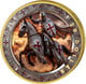 Die Rückseite präsentiert den Templer hoch zu Ross – in voller Aktion, das Schwert erhoben, bereit für den Kampf. Das weiße Streitross trägt ebenfalls die Insignien des Ordens. Diese dynamische Darstellung vermittelt die Kraft und den unbeugsamen Willen der Kreuzritter auf eindrucksvolle Weise.