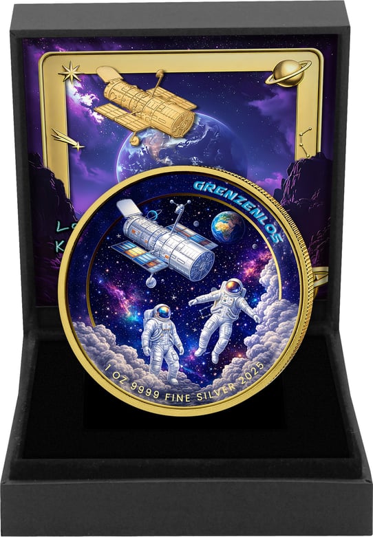 Die Vorderseite dieser teilvergoldeten Münze entführt Sie in die Schwerelosigkeit des Alls. Zwei Astronauten schweben majestätisch vor einem atemberaubenden kosmischen Hintergrund – umgeben von leuchtenden Nebeln in Blau, Violett und Rosa. Das legendäre Hubble-Weltraumteleskop thront über der Szenerie, während im Hintergrund unsere Erde als blaue Perle im All erscheint. Der Schriftzug „GRENZENLOS" unterstreicht die Botschaft dieser einzigartigen Prägung.