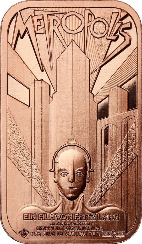 Filmgeschichte zum Anfassen: Der legendäre Metropolis-Film von Fritz Lang als kunstvolles Kupferbarren-Motiv mit beeindruckender Art-Déco-Prägung für Ihre Sammlung