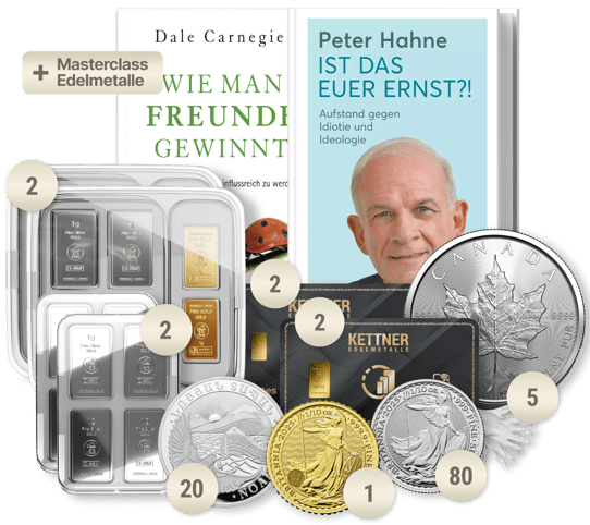 4. Zusätzliche Gratiszugaben sind Münzhandschuhe, die Zugangskarte für die Kettner Edelmetalle Masterclass, sowie ein Buch von Peter Hahne und ein Buch von Dale Carnegie.